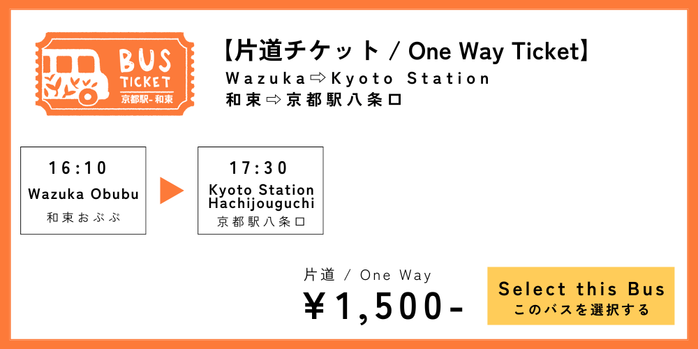 This is a one-way ticket for the direct shuttle bus operated by Kyoto Obubu Tea Farm. It is a one-way ticket that is valid only for the specified time from the Kyoto Obubu Tea Farm Tea Factory bus stop in Wazuka-town to the Kyoto Hachijoguchi shuttle bus stop.