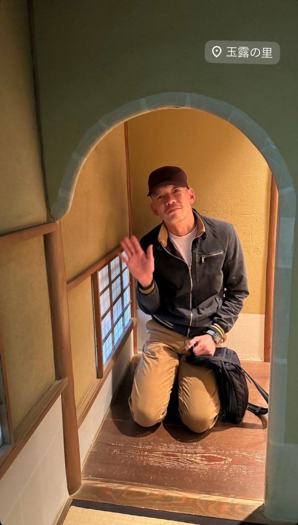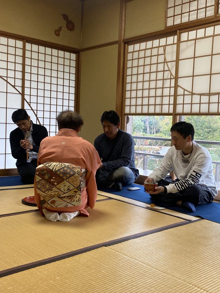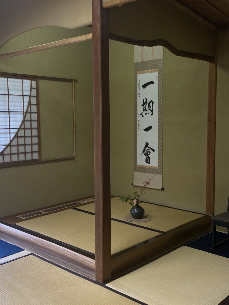 After the competition, we took a tea break at Gyokuro no Sato’s famous tea house Hyogetsu-tei, whose design draws inspiration from the moon and from gourds. In one of the tea rooms, where the host kindly welcomed us, a calligraphy of ichi-go ichi-e beautifully decorated the tokonoma (very symbolic as we talk about this proverb during our tea tours). Some of us enjoyed matcha, others gyokuro, and a few susuricha. At the far end of the grounds, we found Hyouan, a tea ceremony room with a water closet on a three-mat platform. The entrance is the famously narrow nijiriguchi, which requires guests to stoop as they enter—symbolising that everyone, regardless of status, is equal within the tea room. Sen no Rikyu, the renowned tea master of the Sengoku period, is said to have introduced this idea.