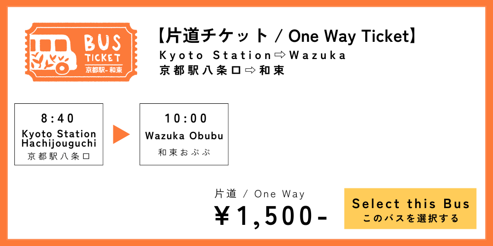 This is a one-way ticket for the direct shuttle bus operated by Kyoto Obubu Tea Farm. It is a one-way ticket that is valid only at the specified time from the Kyoto Hachijoguchi shuttle bus stop to the Kyoto Obubu Tea Farm Tea Factory bus stop in Wazuka-town.