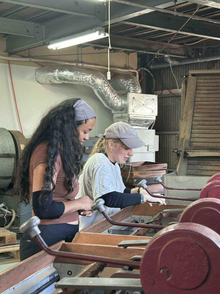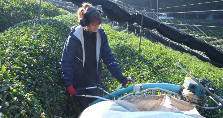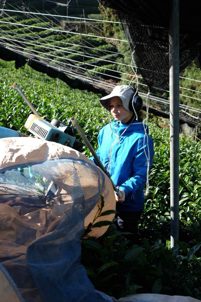 Shannon (#210) and Katrina shaping their autumn bancha (left) and Lotte (#215) harvesting bancha with Flor in Blue Forest Tea Garden. (Photo by Katrina).