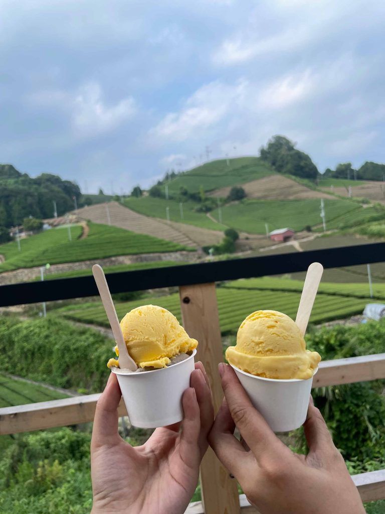 One of the most memorable days was at the start of the summer harvest. I joined Akky-san (our president at Obubu) and Katrina in the fields. We spent the whole day trimming and shading, paused for lunch at a cozy Okonomiyaki restaurant, then treated ourselves to ice cream at DanDan Café before heading home. That evening, we returned to the sencha factory and worked late into the night, processing tea. It was also my first visit to one of Obubu’s highest fields, Tenku. In Japanese, Tenku means Heavens, and the name couldn’t be more fitting for the view over the small village of Wazuka. During a tea break, we even spotted a little anaguma, a Japanese badger, wandering peacefully across the field.