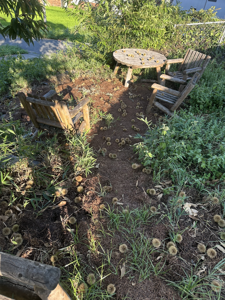 My intern project evolved a bit from my original plan, which was to create a garden space. Instead I decided that I would take the time to fix and improve a couple features around the office tea field that required repair, in order to make the space more accessible. The specific tasks I completed were repairing the loose steps leading from the driveway to the field, straightening and repairing the footers of the original tea club member board, rebuilding the access ramp from the driveway to the top of the field with a retaining wall, trimming the chestnut tree that was taking over the driveway, spreading mulch around the picnic table, and planting a bit of Setcreasea along the rebuilt ramp and wall to hold the soil in place.